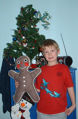 Taylor and his tree. Gingerbread Boy?
